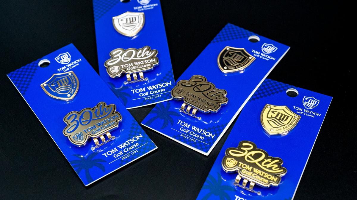 キャップに取り付ける土台には30周年ロゴマークを、マーカーにはトム・ワトソンゴルフコースのロゴマークを基にシンブルなデザインに仕上げました。