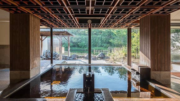 湯船からの風景を綿津見(ワタツミ)の世界に見立て、露天の先には池を配し、気持ちをのんびりとほぐしてくれます。